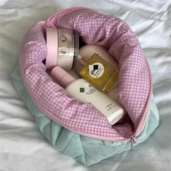Custom Size Quilted Logo Blue Plaid Pattern Cotton Quilted Thick Zipper Beauty Makeup Skin Care Bag